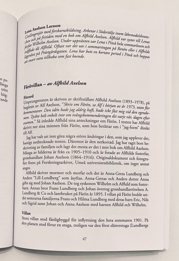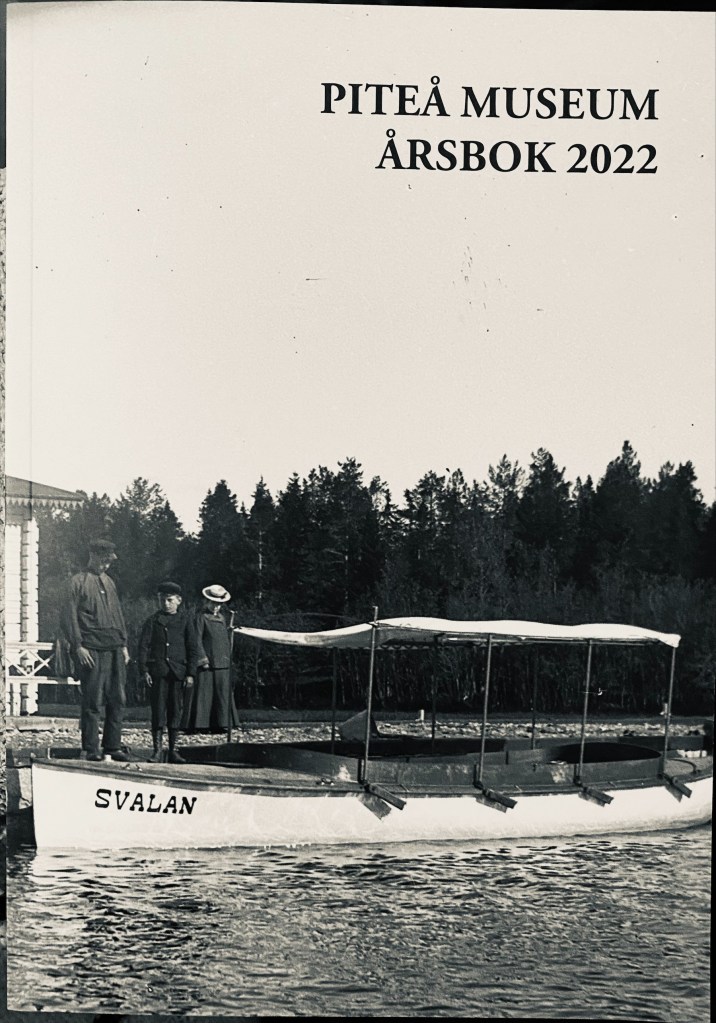 Har precis fått hem några exemplar av den trevliga årsboken som Piteå Museum utkommer med. Det var 3 år sedan jag senast hade med en artikel, men nu är det dags igen! Denna gången handlar den om en vacker trävilla som familjen en gång haft och det är Alfhild Axelson som berättar. Ja, det är kul att kunna bjuda på dessa skatter jag hittar och jag längtar till att få mer tid till nästa storprojekt! Så kul att får möjlighet att dela med sig av historiska fynd. Min farfars far, Johan Axelson, byggde tillsammans med sin kompanjon Frans Lundberg, en vacker trävilla i Piteå skärgård. Han fotade också mycket och dessa foton hittade jag på Umeå Universitetsbibliotek. Tillsammans med en beskrivning av gården, som Alfhild Axelson skrev 1973, har lite historia bevarats lite till eftervärlden. På bokens framsida är båten ”Svalan” som familjerna Axelson och Lundberg använda för att ta sig mellan Piteå stad och Fårön. Till vänster skymtar en gavel till badhuset på bryggan.