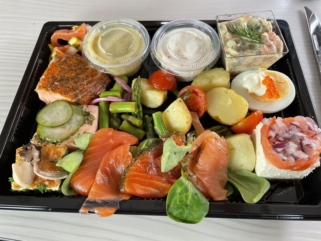 Vi lämnade Ullared på förmiddagen och stannade i Falkenberg vid Laxbutiken. Vilket ställe. Lax i alla former fanns att köpa och vi köpte med oss var sin lunchlåda med blandade lax-godbitar. Rekommenderas varmt!