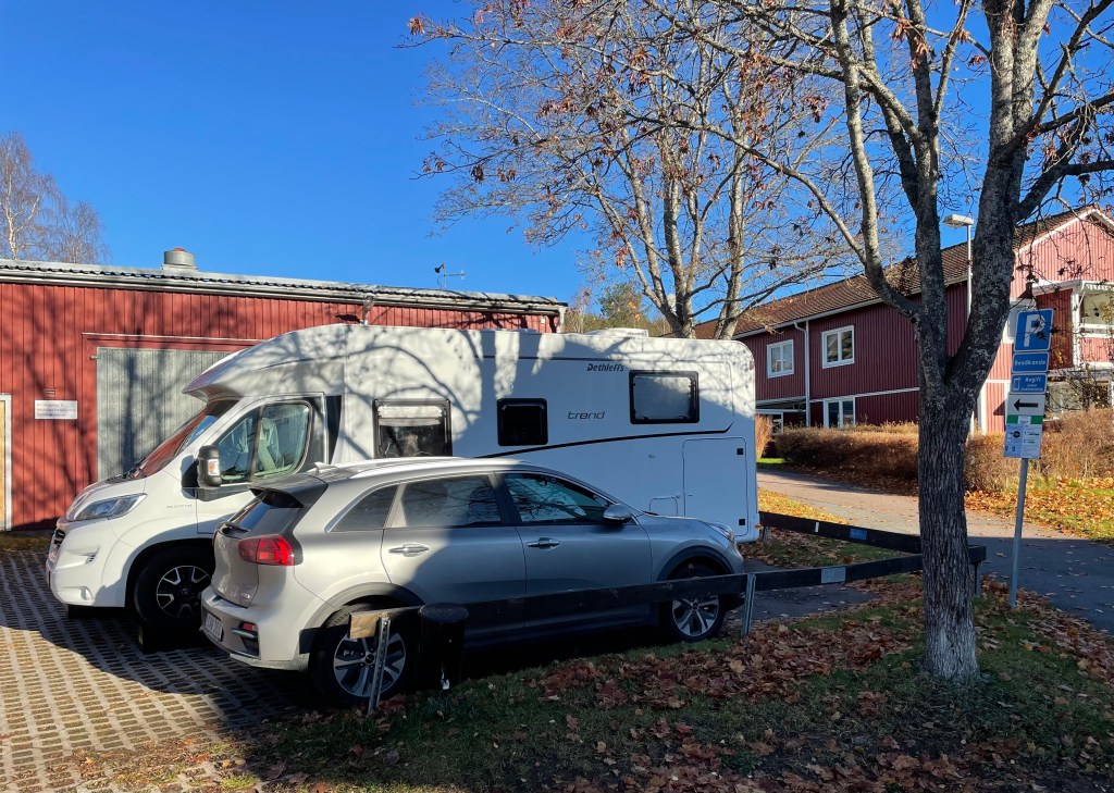 Vi bodde helt enkelt på en parkeringsplats, där vi inte stod med hjulen utanför P-rutan, får man inte göra. Hjälptes av att det bara fanns sidostreck i P-rutan.