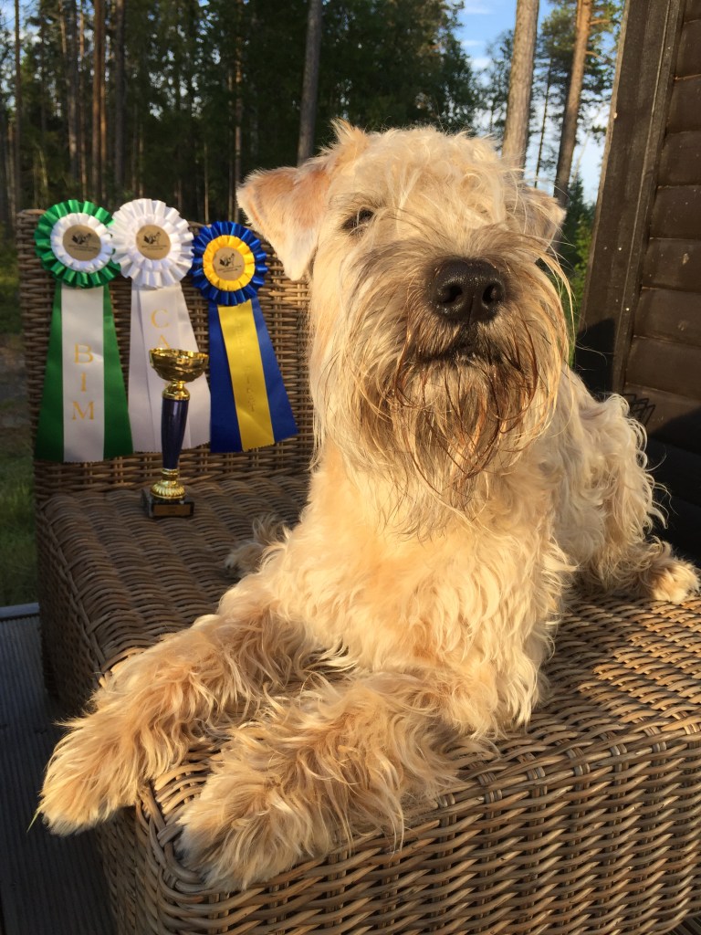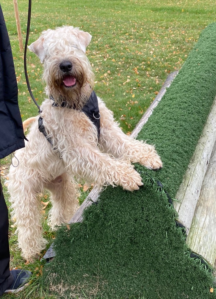 Almus föddes i den första kullen efter Oscar. Han var en riktig drömhund. En mysig och glad hund. En fantastiskt vacker och mycket lättskött päls, vilket inte alltid är fallet med Wheaten Terrier. Han tog 4 cert i Sverige och 1 i Finland innan han var 1.5 år. Han blev också svensk juniorvinnare. Han var rolig att träna med – glad och sprallig – men pandemin gjorde att vi inte kom ut på så jättemycket. Då började vi med Dog Parkour – för det kan man göra själv – och Almus blev den första Wheaten i världen att få en titel i Dog Parkour.