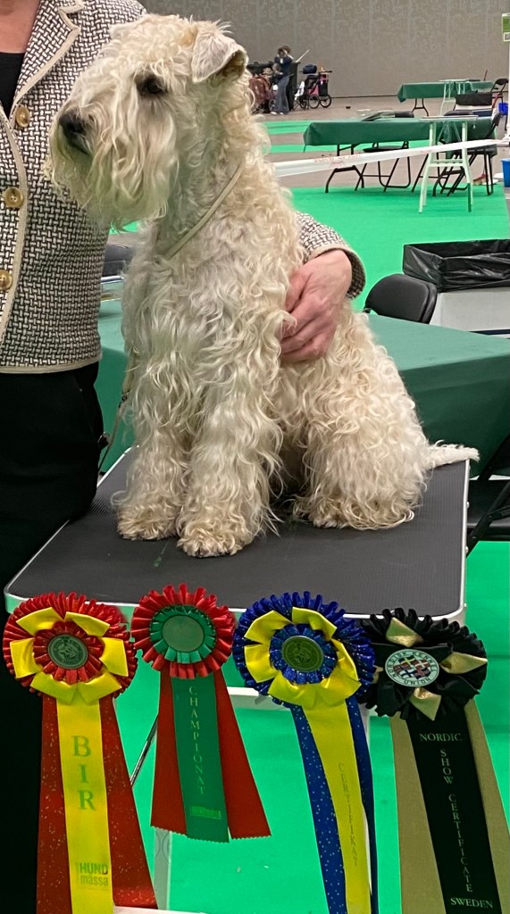 Vi har provat på olika aktiviteter. Hon är lyhörd då hon vill. Eftersom hon älskar andra hundar och alla människor, så älskar hon också utställningar. Det är där hon också lyckats allra bäst. Nordisk Vinnare 2024 på Stockholms Hundmässa med ca 40 startande i rasen slår nog det mesta. Vi har provat på en hel del olika hundsporter, men hennes kärlek till allt som rör sig gör att hon gärna tar egna initiativ. Rallylydnad Nybörjarklass gick bra – då var hon ju kopplad. Men i Rally Fortsättning och Agility, måste hon ta ett ärevarv även till domarna. Är de tråkiga testar hon inroparen eller kanske publiken. Jag hoppas det ger sig med tiden. Viltspår är hon också duktig i, men vill inte gärna släppa ifrån sig klöven – vi tränar på det.